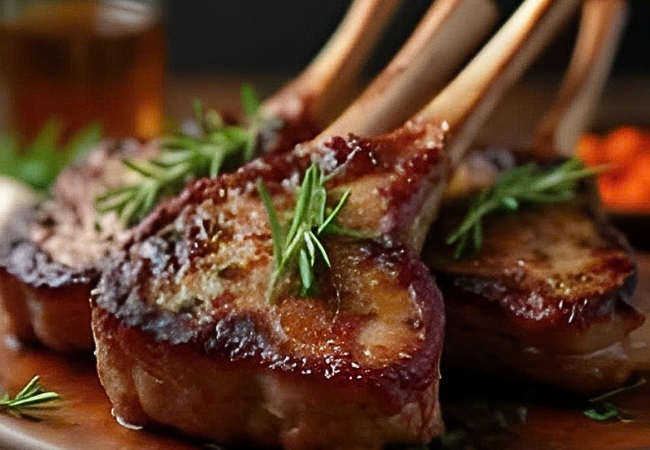 Gia vị được rắc vừa đủ để tôn lên vị ngọt tự nhiên của thịt. Kèm theo là khoai tây nghiền và rau củ nướng tạo nên bữa ăn đầy đủ và hấp dẫn.