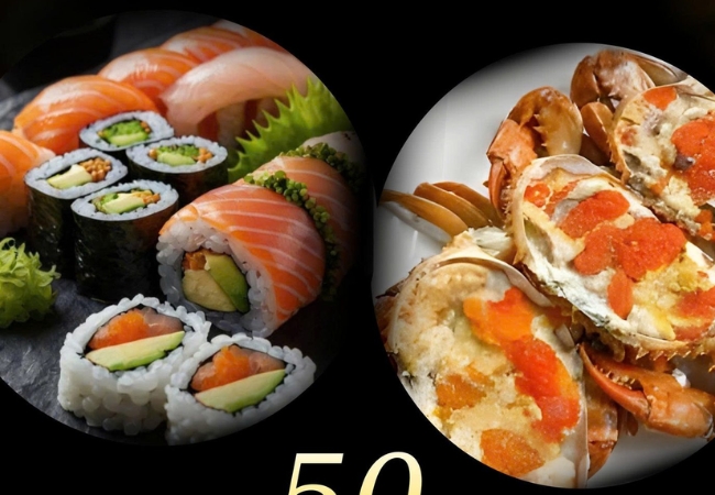 Thực đơn chính của du thuyền Elisa là nơi hội tụ tinh hoa ẩm thực từ khắp thế giới. Sashimi Nhật Bản tươi ngon với từng lát cá được thái mỏng đều, tan ngay trong miệng.