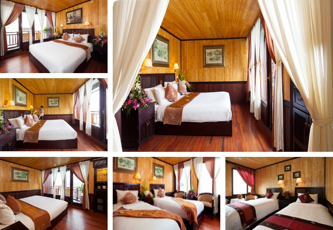 Hệ thống phòng ngủ trên Du Thuyền Jasmine Hạ Long 2N1Đ được thiết kế tỉ mỉ để tận dụng tối đa tầm nhìn hướng vịnh. Với tổng cộng 24 phòng nghỉ, con tàu đáp ứng đa dạng nhu cầu của du khách, từ các cặp đôi tìm kiếm sự lãng mạn đến những gia đình muốn có không gian gắn kết.