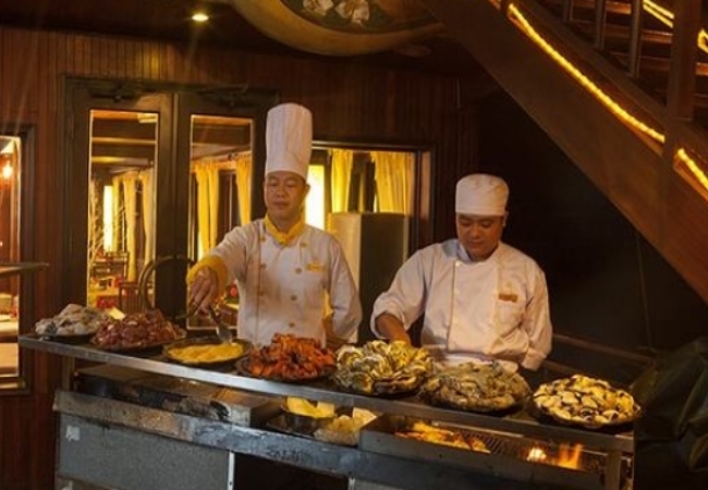 Nhà hàng trên tàu là nơi tinh hoa ẩm thực biển hội tụ, từ những món hải sản tươi rói được đánh bắt trong ngày đến những món ăn truyền thống Việt Nam. Đặc biệt, quầy bar luôn sẵn sàng phục vụ các loại đồ uống đa dạng bất kể thời gian nào. Bạn có thể nhâm nhi ly vang đỏ trên boong tàu trong lúc ngắm nhìn những dãy núi đá nhấp nhô dưới ánh trăng.