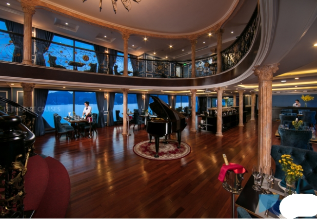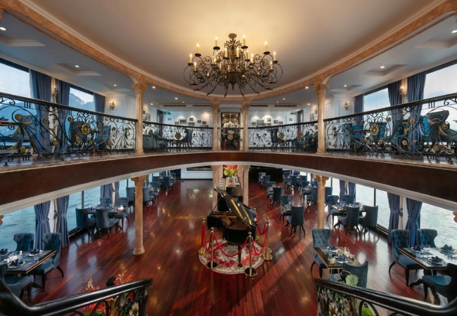 Điểm nhấn độc bản của tàu chính là nhà hàng được xây dựng theo kiến trúc nhà hát hoàng gia, tạo nên một không gian thưởng thức ẩm thực có một không hai tại Việt Nam. Đây chính là lựa chọn lý tưởng cho những ai đang tìm kiếm một sự kết hợp giữa kỳ nghỉ dưỡng biển và trải nghiệm nghệ thuật thượng lưu.