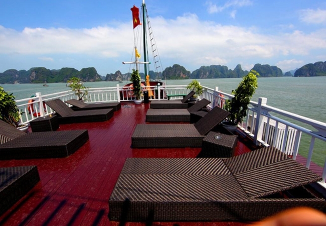 Boong tàu được thiết kế hoàn toàn mở để tận dụng lợi thế của tầm nhìn màu xanh tuyệt đẹp ra vịnh Hạ Long. Hơn nữa, đây còn là khu vực lãng mạn để du khách thư giãn dưới bầu trời đầy sao vào buổi tối, tạo nên những khoảnh khắc đáng nhớ.