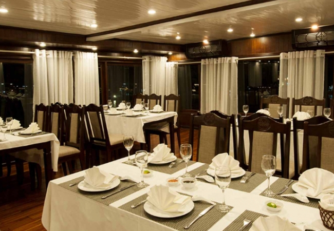 Nằm ở phần đầu của tàu là nhà hàng được thiết kế để phục vụ tối đa 36 khách hàng. Các bàn riêng biệt và ghế được chạm khắc bằng gỗ quý tạo nên không gian ăn uống sang trọng và thoải mái. Du khách được phục vụ các món ăn ngon miệng cùng với việc ngắm cảnh lãng mạn trong suốt bữa ăn.
