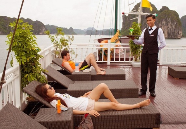Sàn tắm nắng với ghế salon thoải mái là điểm nhấn của con tàu. Đây là nơi lý tưởng để du khách thư giãn, ngắm cảnh và tận hưởng không khí trong lành của biển cả. Bạn sẽ ngạc nhiên vì những thiết kế thông minh, hiệu suất vận hành tốt và sundeck rộng rãi.