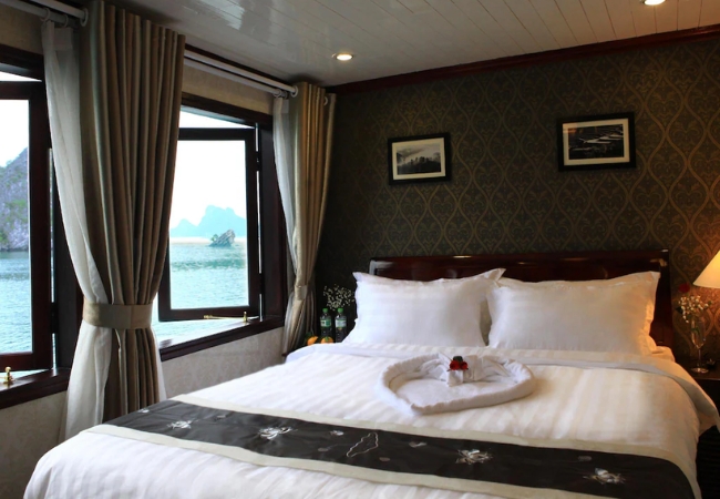 Với 14 cabin được thiết kế sang trọng, mỗi phòng đều trang bị đầy đủ tiện nghi như phòng tắm riêng, máy lạnh, khăn trải giường cao cấp và các tiện ích cần thiết. Tất cả cabin đều có cửa sổ thoáng rộng, giúp du khách thưởng ngoạn khung cảnh thơ mộng của vịnh Hạ Long ngay tại căn phòng riêng.