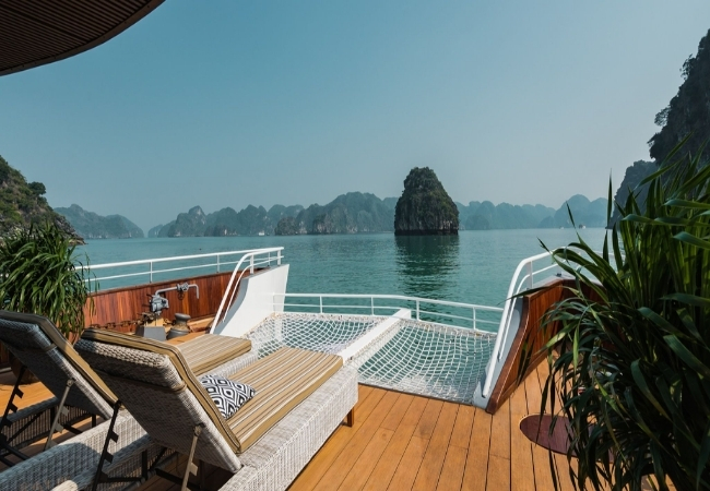 Một trong những khu vực được yêu thích nhất chính là boong tàu phía sau, nơi bố trí cầu trượt nước và phao nổi đầy màu sắc. Đây là không gian dành riêng cho những ai yêu thích sự năng động và muốn tận hưởng làn nước mát lành của vịnh Lan Hạ một cách trực diện nhất. Trong khi đó, khu vực sundeck phía trên lại là chốn bình yên để du khách nằm thư giãn trên võng lưới và đón nhận những làn gió biển trong lành.