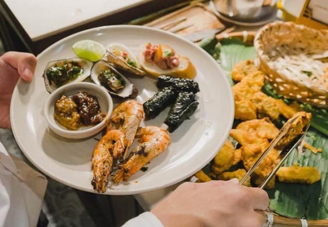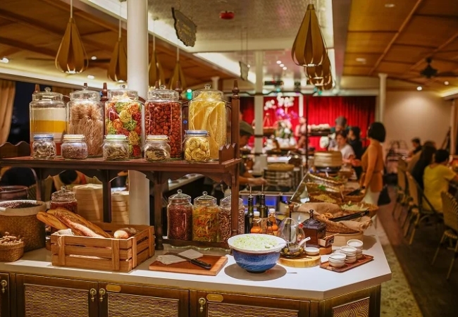 Điểm nổi bật của trải nghiệm ăn tối trên du thuyền Bonsai chính là hình thức buffet đa dạng. Thực đơn được thiết kế kỹ lưỡng, kết hợp hài hòa giữa món Á và món Âu để đáp ứng khẩu vị của mọi thực khách.