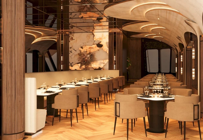 Vừa chính thức hạ thủy vào ngày 02/04/2025, con tàu mang vẻ đẹp hiện đại với cấu trúc thép vỏ kép vô cùng chắc chắn và an toàn. Sở hữu chiều dài ấn tượng 55,65m cùng chiều rộng 12,4m, tàu tạo nên một không gian bề thế nhưng vẫn thanh thoát trên mặt nước. Hệ thống động cơ Yanmar mạnh mẽ đảm bảo cho tàu vận hành êm ái, giúp thực khách tận hưởng trọn vẹn những giây phút thư giãn mà không bị làm phiền bởi tiếng ồn.