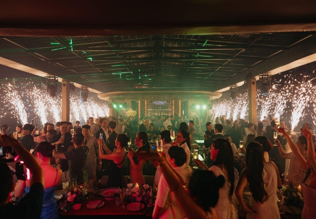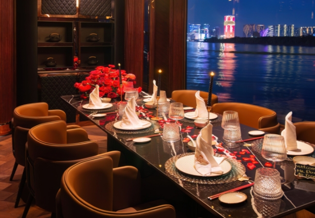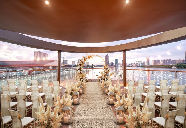 Thay vì không gian nhà hàng truyền thống, một đám cưới trên du thuyền giữa làn nước xanh mát và ánh hoàng hôn buông xuống sẽ là kỷ niệm khó quên. Du khách sẽ có được những thước phim cưới đậm chất điện ảnh khi con tàu lướt qua cầu Ba Son hay tòa nhà Landmark 81. Đội ngũ trang trí sẽ hỗ trợ biến hóa không gian tàu theo phong cách riêng của mỗi cặp đôi, từ cổ điển đến hiện đại.
