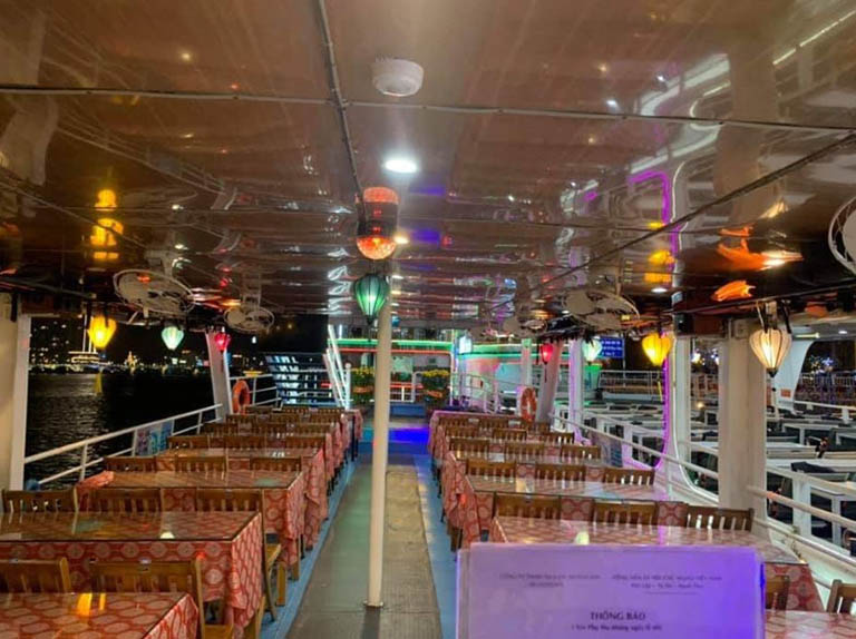 – Tầng 2: Nằm ở trên cao và được thiết kế mở ở ba phía, tầng 2 cho phép du khách tận hưởng tầm nhìn bao quát toàn cảnh sông Hàn lung linh ánh đèn và những cây cầu nổi tiếng như cầu Rồng, cầu quay sông Hàn. Hệ thống mái che bằng bạt kéo linh hoạt giúp du khách có thể thoải mái ngắm cảnh mà không lo ngại về thời tiết.