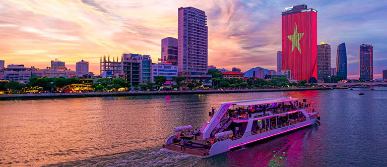 Hành trình kéo dài 120 phút sẽ đưa du khách đi qua những cây cầu nổi tiếng của Đà Nẵng, nhưng điểm nhấn chính là khi du thuyền di chuyển ra ngoài vịnh biển, qua cầu Thuận Phước và hướng đến Cảng Tiên Sa. Đây là lúc bạn được chiêm ngưỡng khoảnh khắc hoàng hôn “non nước hữu tình” tuyệt đẹp. Cả bầu trời và mặt nước sông Hàn như được nhuộm một lớp áo choàng vàng cam rực rỡ, lấp lánh dưới những tia nắng cuối ngày. Xa xa, những ngọn núi ẩn hiện trong mây trời, tạo nên một khung cảnh thiên nhiên hùng vĩ nhưng cũng vô cùng lãng mạn. Đây chắc chắn là một trải nghiệm độc nhất vô nhị, nơi bạn có thể thư giãn và lưu lại những bức ảnh đáng giá.