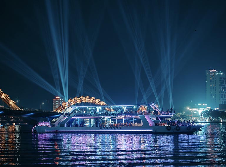 Khi thành phố lên đèn, du thuyền Poseidon sẽ đưa bạn vào một hành trình khám phá vẻ đẹp lung linh của sông Hàn về đêm. Khởi hành từ bến du thuyền, Poseidon sẽ lướt nhẹ qua những cây cầu huyền thoại, mỗi cây cầu lại mang một vẻ đẹp riêng khi được thắp sáng. Đó là cầu Sông Hàn – cây cầu quay duy nhất ở Việt Nam, sau đó di chuyển đến cầu Thuận Phước, nơi bạn có thể chiêm ngưỡng vẻ đẹp uy nghi của nó từ xa. Từ đó, du thuyền sẽ quay đầu, đưa bạn đến gần hơn với những điểm check-in không thể bỏ qua như cầu Tình Yêu lãng mạn, công viên Cá Chép Hóa Rồng và đặc biệt là cầu Rồng đầy ấn tượng.
