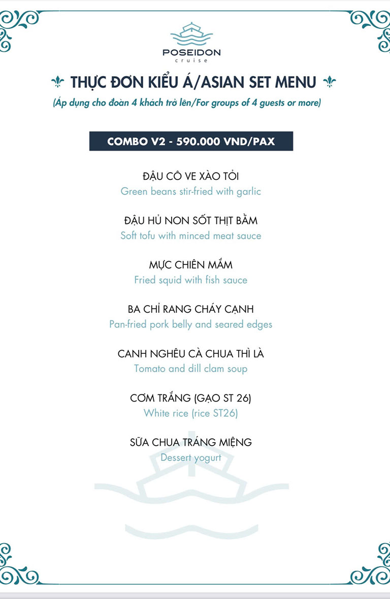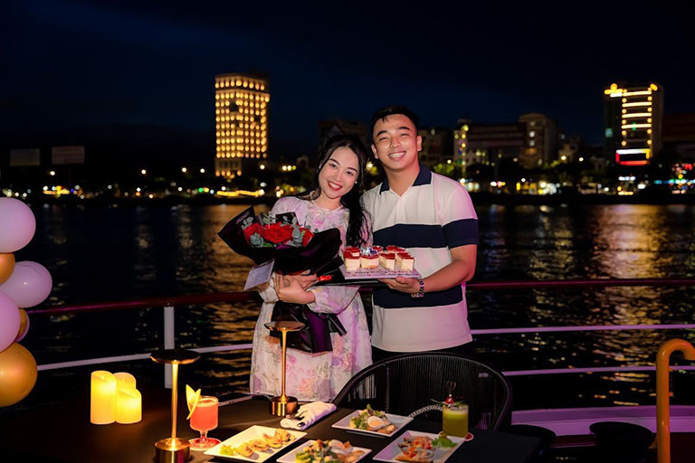 Ngoài ra, du thuyền còn cung cấp nhiều combo vé ăn tối hấp dẫn với mức giá khác nhau, tùy thuộc vào thực đơn bạn lựa chọn. Điều này giúp bạn có thể kết hợp giữa việc ngắm cảnh lãng mạn và thưởng thức một bữa tối ngon miệng ngay trên sông Hàn.