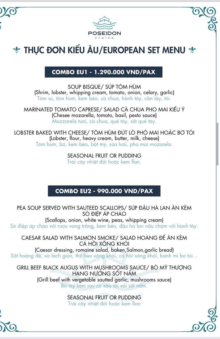 | + Set V1: 890.000 VNĐ / khách + Set V2: 990.000 VNĐ / khách | + Set EU1: 1.790.000 VNĐ / khách + Set EU2: 1.490.000 VNĐ / khách + Set EU3: 1.290.000 VNĐ / khách |