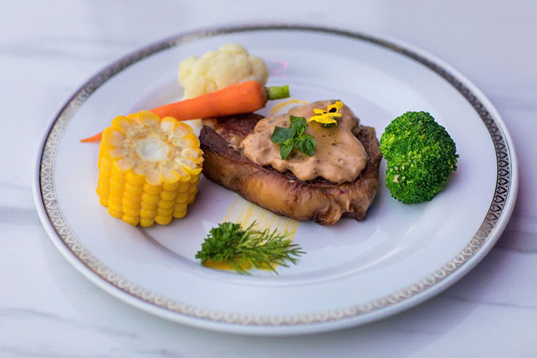 – Món chính: Là bò Mỹ thượng hạng nướng sốt nấm, mang lại hương vị đậm đà, mềm mại, được phục vụ cùng rau củ xào tỏi.