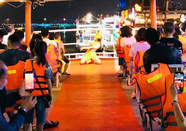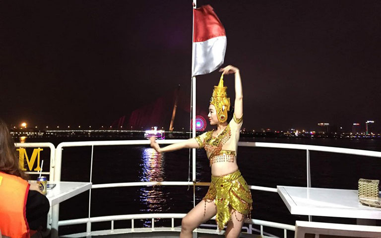 Không chỉ là một hành trình ngắm cảnh, du thuyền Sweet Time còn mang đến những chương trình giải trí đặc sắc để mỗi khoảnh khắc đều trở nên đáng nhớ. Quý khách sẽ được thưởng thức màn biểu diễn múa Chăm đầy mê hoặc, một nét đẹp văn hóa truyền thống của người Chăm. Những điệu múa uyển chuyển, huyền bí sẽ kể câu chuyện về văn hóa và tín ngưỡng, tạo nên một không gian nghệ thuật đầy ấn tượng ngay giữa lòng sông Hàn.
